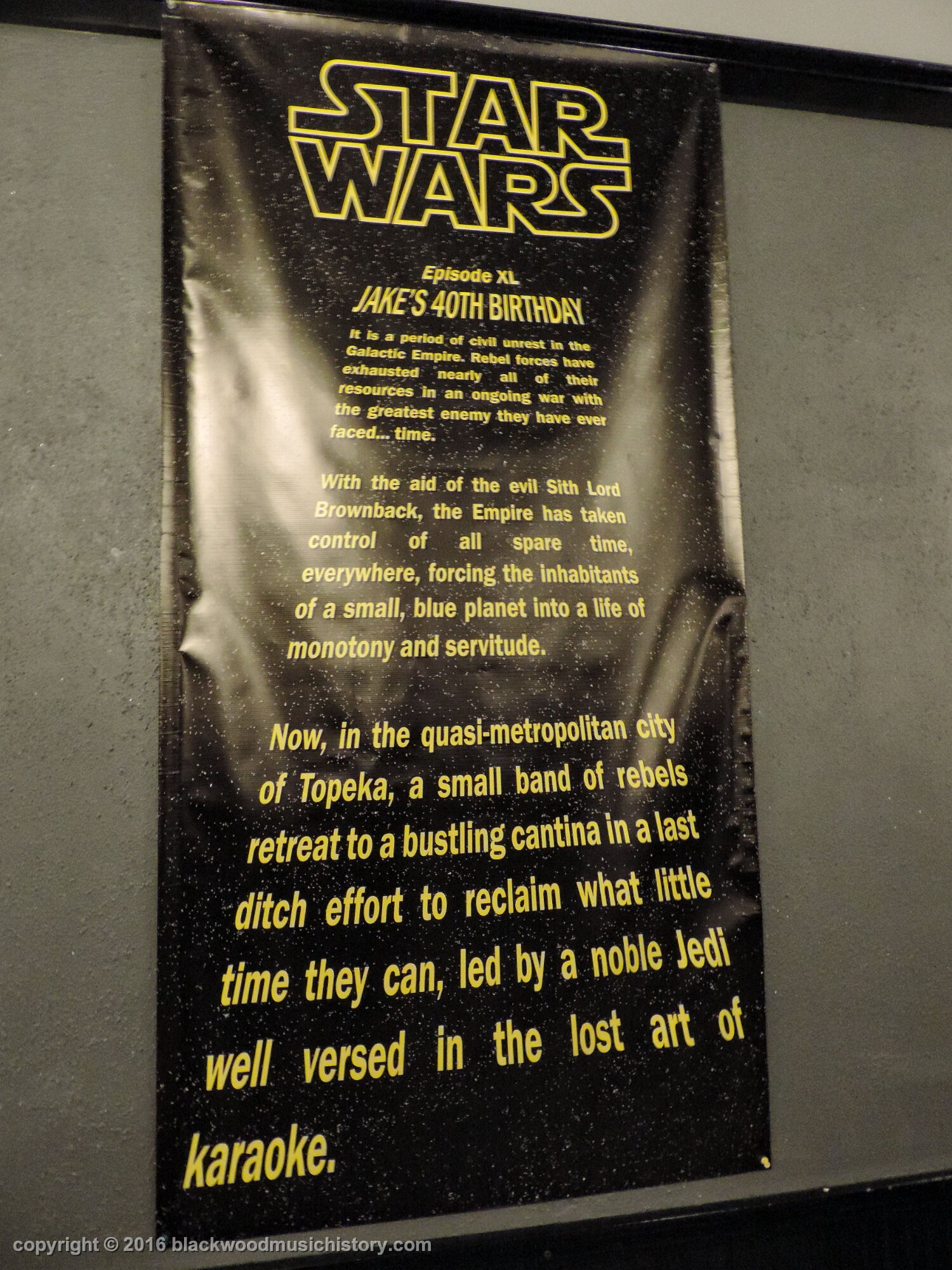 Awesome banner made by Wade Brashear! Download it and zoom in to read it. If you know Jake, you will not be surprised the entire party was a Star Wars theme! Jake was completely surprised! Here he is still trying to take it all in.