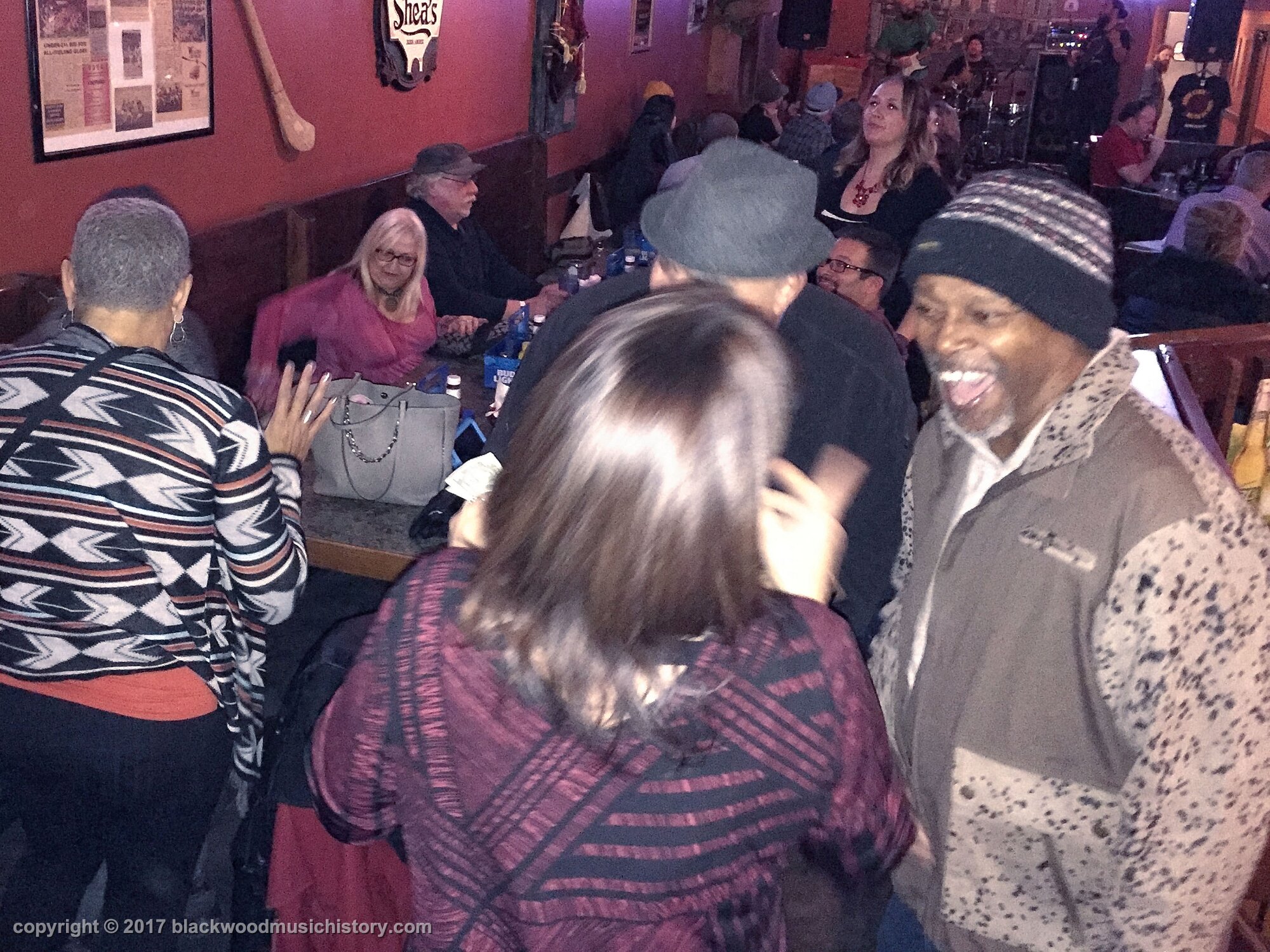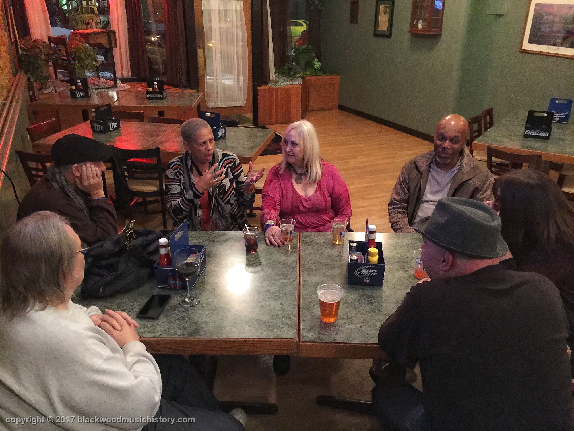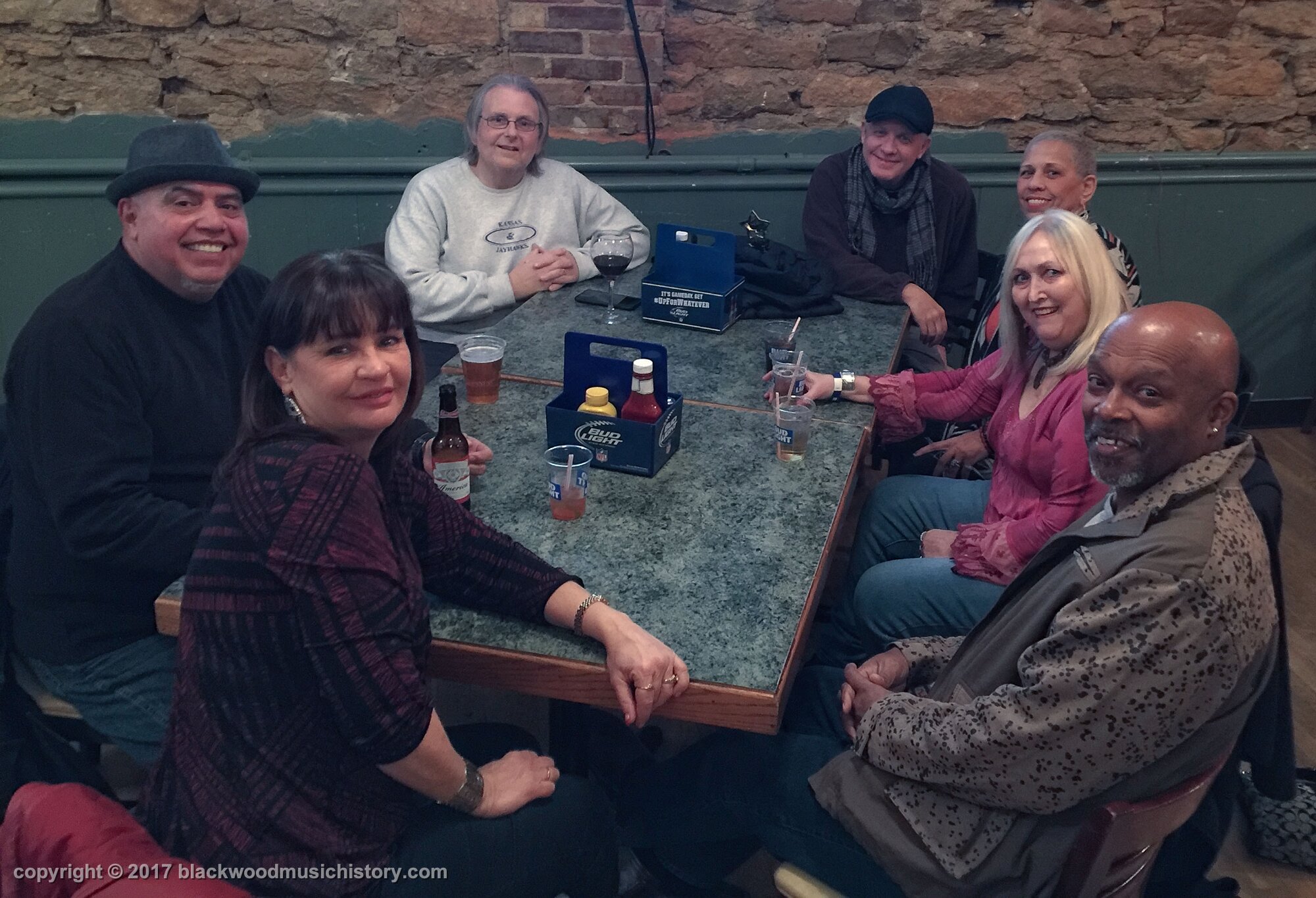though the band was amazing, we all adjourned next door to visit. (clockwise from lower left) Chris Luttjohann (back to camera, RIP), Randy Wills, Lyn Laws, Roxanne DeGraw, Michael Laws, Marta Barron (partially obscured), and Ric Barron (back to camera, RIP)